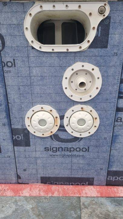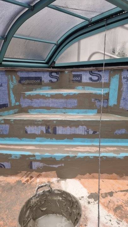 Chez notre client, nous avons commencé par réaliser une chape de fond pour restructurer le fond de forme afin d’adapter un carrelage, en remplacement du liner existant.